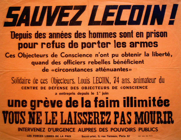 A l’âge de 22 ans déjà, jeune recrue, il refuse de marcher avec son régiment contre une grève des cheminots. Il est de tous les combats pour la liberté. En 1948, parut le premier numéro de Défense de l’Homme, revue mensuelle qu’il venait de créer. En décembre de la même année, Lecoin y fit paraître un article intitulé « Amnistie pour les nôtres, amnistie pour les leurs, amnistie pour tous ». Condamnant les épurations sauvages de la Libération et les persécutions qui se prolongeaient, le vieil anarchiste réclamait l’élargissement de tous les prisonniers, y compris les internés pour fait de collaboration. « Jamais, disait-il, je ne pourrai m’acharner sur l’homme blessé, sur l’homme à terre – se serait-il montré le plus haïssable alors qu’il se tenait debout. » Son respect de la vie et de la liberté n’était pas à sens unique. En 1962, il obtient que les objecteurs de conscience ne soient plus traités comme des délinquants.