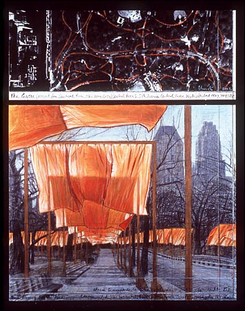 A travers Central Park, 7500 portiques de 5 mètres de haut sur 37 kilomètres. En référence à la tradition japonaise des torii à l’entrée des tombeaux shinto. Le cinéaste Albert Maysles, 78 ans, fixe sur la pellicule » The Gates « .