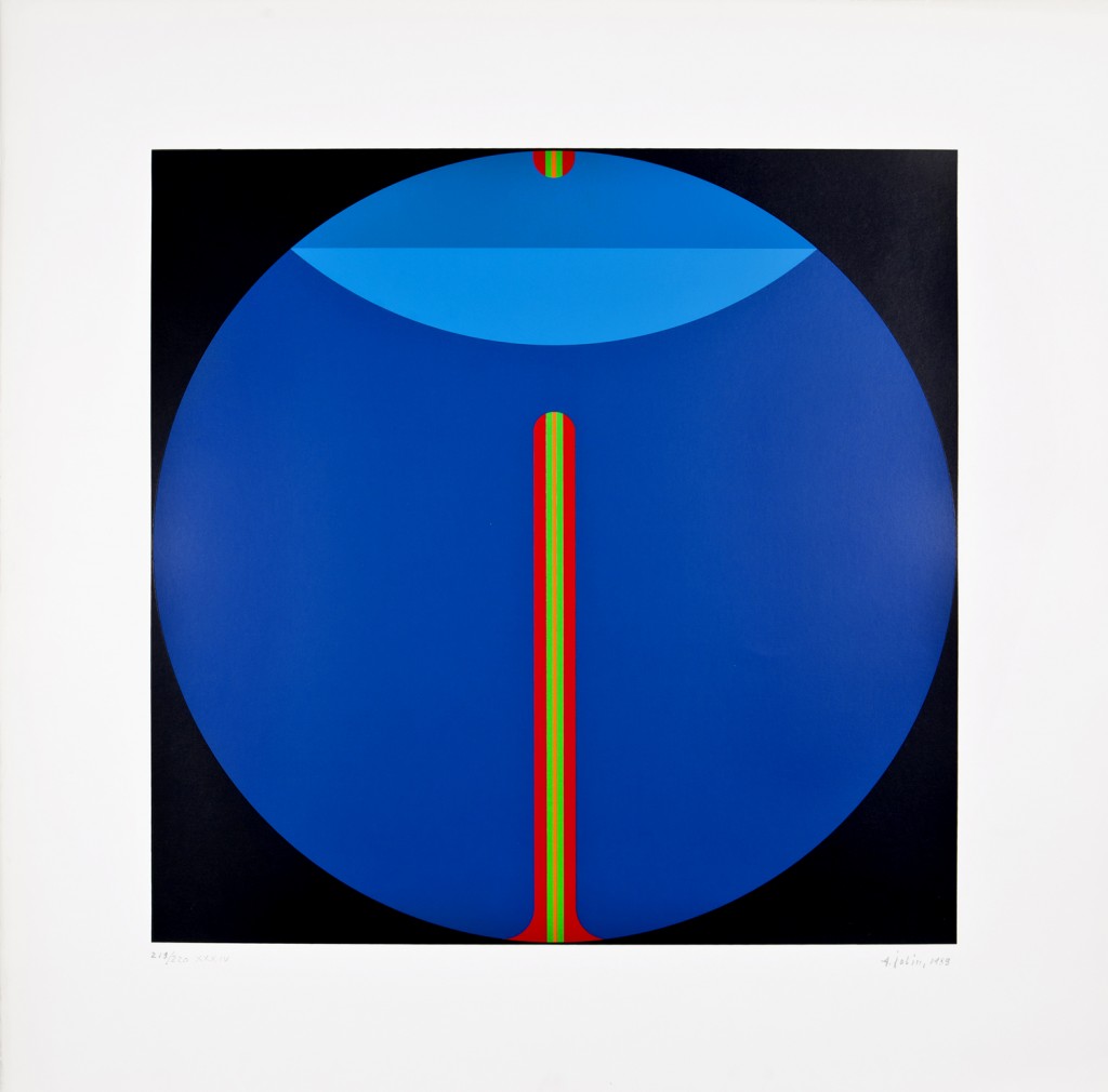 L’abstraction géométrique nait du cubisme au début du XXe siècle. Ses précurseurs célèbres sont Kupka et Delaunay pour la couleur, Malevitch et Mondrian pour la forme et la ligne. En 1950, Arthur Jobin devient le premier peintre romand à exposer des toiles abstraites à Lausanne. Deux tableaux de cette date montrent des compositions de rectangles et de carrés qui se superposent et se croisent dans des coloris chauds allant du brun au jaune en passant par le rouge. La présence de formes rectangulaires sera récurrente chez lui jusqu’à la fin des années soixante. Puis, la source d’inspiration du peintre se déplace vers l’héraldique et les blasons, la peinture en aplat d’emblèmes ronds sur formats carrés (acrylique sur bois ou lithographies). Il nommera cette production artistique « emblématique« . L’artiste énonce clairement son projet :
