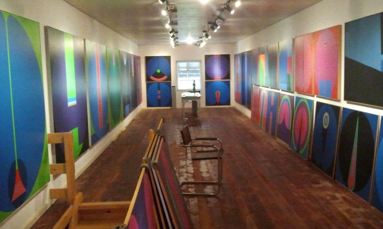 La palette de l’artiste contient sept couleurs. Chaque couleur est composée de quatre couches d’acrylique déposées avec minutie pour éviter toute trace de pinceau.