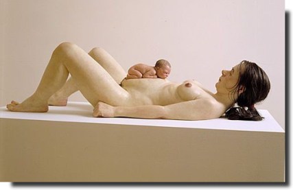 Son père était fabricant de jouets en bois et sa mère réalisait des poupées de chiffon. Ron Mueck (1958)  débute dans l’industrie du spectacle avec la modélisation de marionnettes, puis produit des mannequins pour la publicité. C’est en 1997, avec l’appui de sa belle-mère Paula Rego, qu’il expose à Londres sa sculpture Dead Dad, le corps réduit de son père. Depuis, son travail reproduisant minutieusement le corps humain à l’aide de silicone et de résine synthétique, dans des dimensions incongrues, connait une notoriété mondiale.