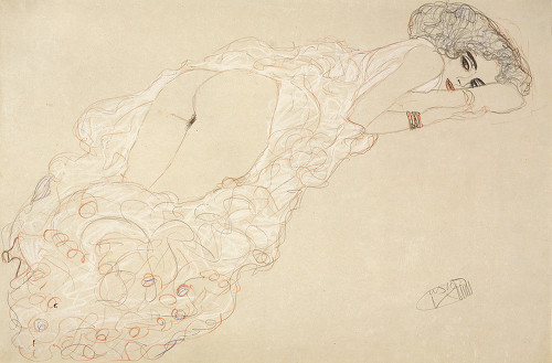Gustav Klimt est connu pour ses riches décorations dorées, ses ornementations chatoyantes, il est aussi un dessinateur hors-pair et se permet beaucoup de liberté dans ses carnets de croquis. Hélas, nombre d’entre eux ont disparus lors d’un incendie chez Emilie Flöge.