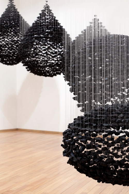 …et des sculptures-installations formées de morceaux de charbon suspendus à des fils de nylon. Le charbon, en Corée, est un matériau traditionnel utilisé symboliquement dans un but de purification, pour éloigner les esprits, pour annoncer une naissance ou même en cuisine. Son enfance, passée dans la nature, lui a donné le goût du vent, des montagnes et des arbres. Il choisit le charbon (sorte de fantôme de l’arbre) comme base de son travail sur la relation entre la nature et l’humain.
