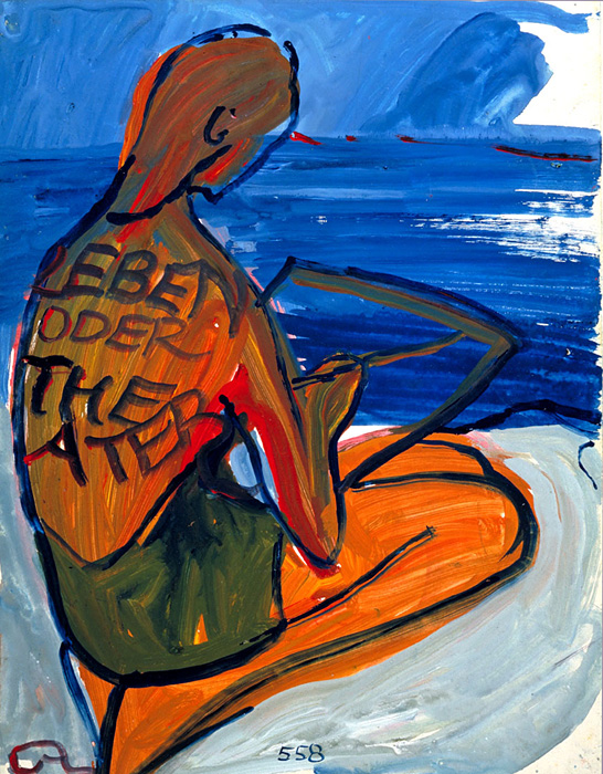 Entre 1940 et 1942, exilée au sud de la France chez ses grands-parents, elle peint plus de 1300 gouaches de petit format (elle en sélectionne 784) qui racontent l’histoire de Charlotte Kann (=peut), son histoire et celle de son temps. Intitulée « Vie? ou Théâtre? », l’oeuvre est composée de trois parties, comme un opéra peint, écrit et chanté. Un geste de remémoration, de résilience artistique, de survie prémonitoire : « afin de recréer les profondeurs de son être », dans lequel elle intègre des textes, des citations littéraires et des créations musicales.