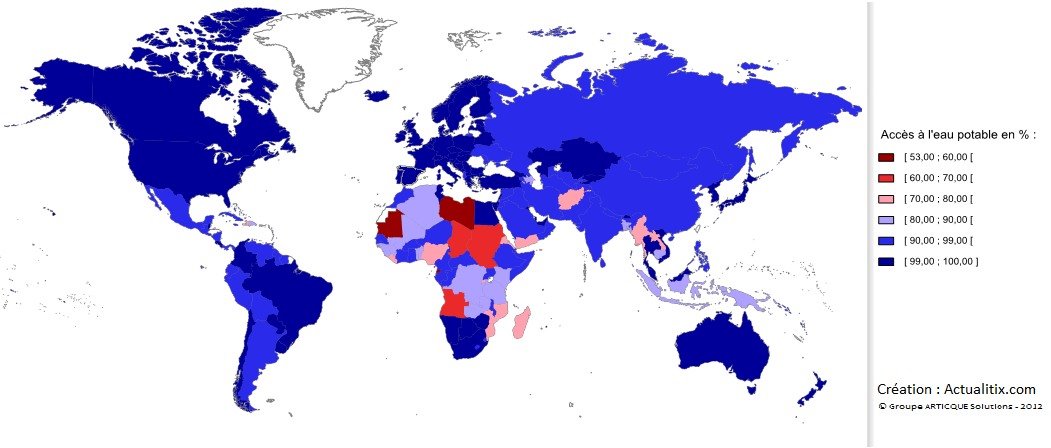 800 millions (11%) de personnes restent sans accès à une « eau améliorée » dans le monde selon les Nations unies. En Afrique, la pénurie d’eau pèse sur une partie importante de la population. Au sud du Sahara, le tiers de la population (300 millions de personnes)n’a pas accès à l’eau potable et un habitant sur deux souffre de cette pénurie ou du manque d’assainissement de l’eau. L’accès à l’eau potable est pourtant reconnu comme étant un droit fondamental par l’ONU depuis 2010.