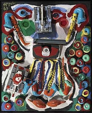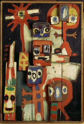 Karel Appel , artiste peintre né à Amsterdam, a exploré divers médias comme la sculpture, le vitrail. le collage, la lithographie… Son oeuvre est caractérisée par le refus des conventions, le rejet de la société matérialiste et l’expérimentation. Dès 1947, il produit des assemblages de bois et d’objets en relief, les objets poubelles. Ces « enfants qui questionnent », dont il créera plusieurs versions, sont pour lui les témoins dérangeants d’un monde injuste, des innocents qui accusent.