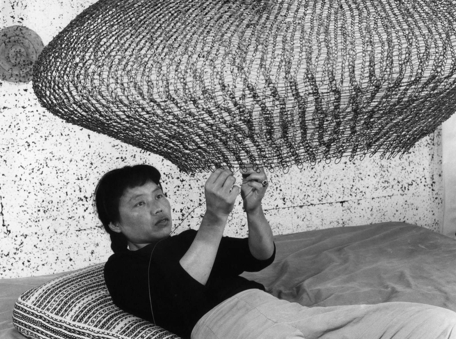 Shared_Ruth+Asawa_b_2_making Untitled (Ruth Asawa on bed kneeling inside looped wire sculpture), Imogen Cunningham (ami de Ruth)