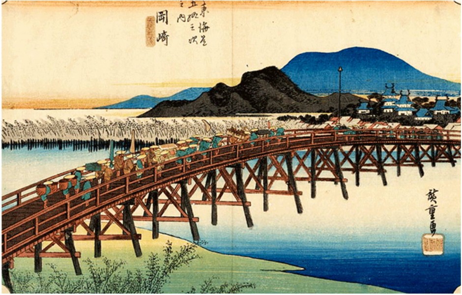 Le tableau ci-dessus est la 38ème station des cinquante-trois stations du Tokaido qui sont une série d’estampes japonaises et décrivent la route de Edo à Kyoto. Une influence pour plusieurs peintres occidentaux, dont les impressionnistes.