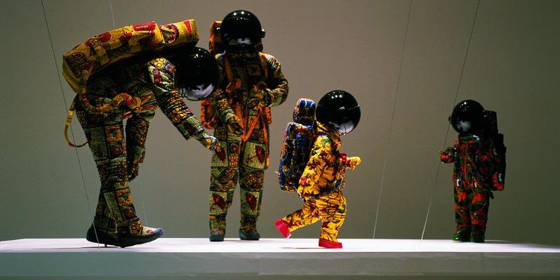 Cet artiste africain représente ci-dessus une famille vêtue de combinaisons spatiales en Dutch Wax (tissu imprimé semblant typiquement africain) . Il évoque l’exploration de l’espace comme un nouveau colonialisme.