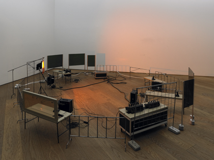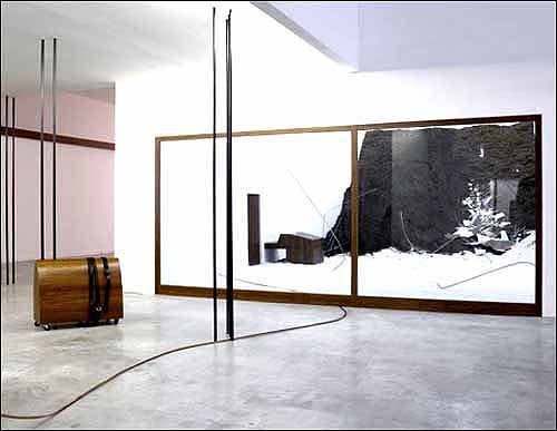 Tatiana Trouvé, « Bureau of Implicit Activities, Waiting Module no. 1 « – 2002, Plexiglas, imitation leather, iron, wood, HI-FI, music cd 186 x 165 x 80 cm Installation, Kunstverein Freiburg, 2003 Photo: Bernhard Strauss