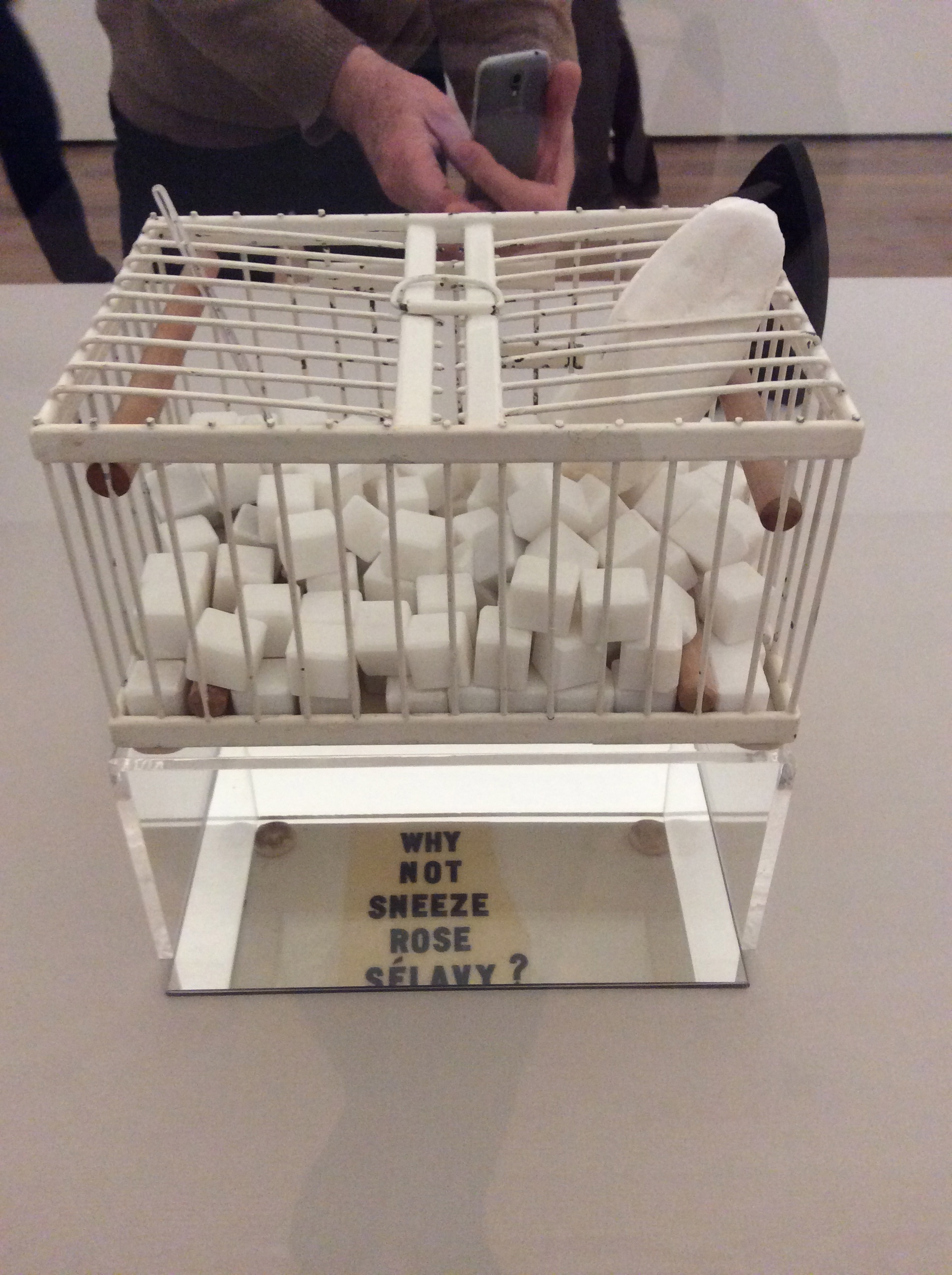 Marcel Duchamp, « Why not sneeze Rose Sélavy? », 1921 (métal peint, cubes de marbre, os de seiche, thermomètre)Et « Why not sneeze Rose Sélavy? » : Ces morceaux de sucre sont en réalité des cubes de marbre. L’impression de poids si l’on soulève la cage en est faussée. Léger ou lourd? La cage évoque l’enfermement et par contraste l’envol, la légèreté, la liberté. Le thermomètre est à mercure… Mercure, le dieu ailé. L’os de seiche affûte le bec des oiseaux. Ou l’esprit? il pourrait aussi figurer aussi la mort.Une hypothèse d’explication sur le blog « Au livre bleu ». Ah, cher Marcel, tes énigmes insolubles me transportent!