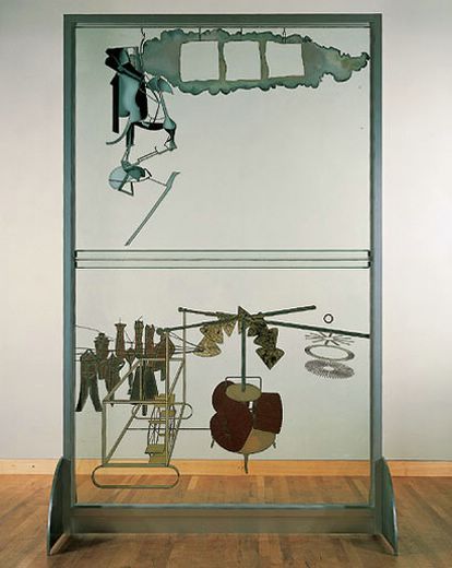 Cette oeuvre de Marcel Duchamp , définitivement inachevée après 8 années d’élaboration, est le résultat de recherches complexes dont l’artiste a laissé des traces dans plusieurs carnets et notes (la boîte verte). La partie supérieure représente l’élément féminin, la mariée. La partie inférieure est consacrée aux éléments masculins, soit les neufs moules mâlic (les célibataires), la glissière, le moulin à eau, les tamis, le ciseau et la broyeuse de chocolat (les célibataires broient leur chocolat eux-même…), accompagnés des « témoins oculistes » et de la lentille. Ces deux parties sont séparées par une barre, le vêtement de la mariée.