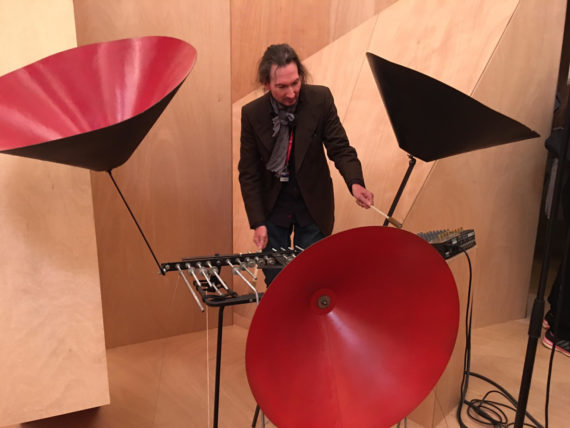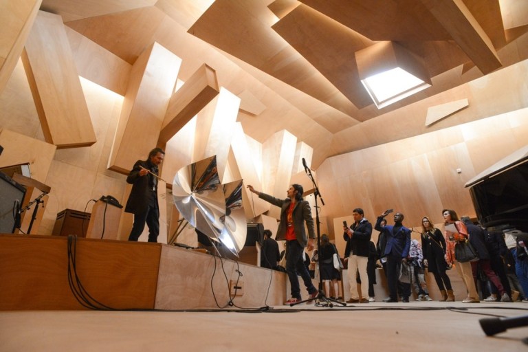 Inspiré par l’artiste allemand Kurt Schwitters (1887-1948) et son Merzbau, le projet de Xavier Veilhan est une situation, plutôt qu’une performance. Il implique de plonger le spectateur dans l’origine même de la création artistique, musicale en particulier. Une fusion entre les sens de l’ouïe et de la vue, grâce à une architecture cubiste ou futuriste et des univers musicaux allant du jazz au baroque en passant par le rock et la musique électronique. Loin de ses statues facettées, Xavier Veilhan met cette fois en avant l’univers de la musique, assisté de deux commissaires d’exposition: l’artiste Christian Marclay et Lionel Bovier, directeur du Mamco de Genève, tous deux suisses.