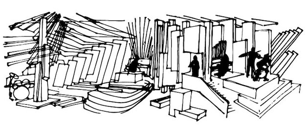 Inspiré par l’artiste allemand Kurt Schwitters (1887-1948) et son Merzbau, le projet de Xavier Veilhan est une situation, plutôt qu’une performance. Il implique de plonger le spectateur dans l’origine même de la création artistique, musicale en particulier. Une fusion entre les sens de l’ouïe et de la vue, grâce à une architecture cubiste ou futuriste et des univers musicaux allant du jazz au baroque en passant par le rock et la musique électronique. Loin de ses statues facettées, Xavier Veilhan met cette fois en avant l’univers de la musique, assisté de deux commissaires d’exposition: l’artiste Christian Marclay et Lionel Bovier, directeur du Mamco de Genève, tous deux suisses.