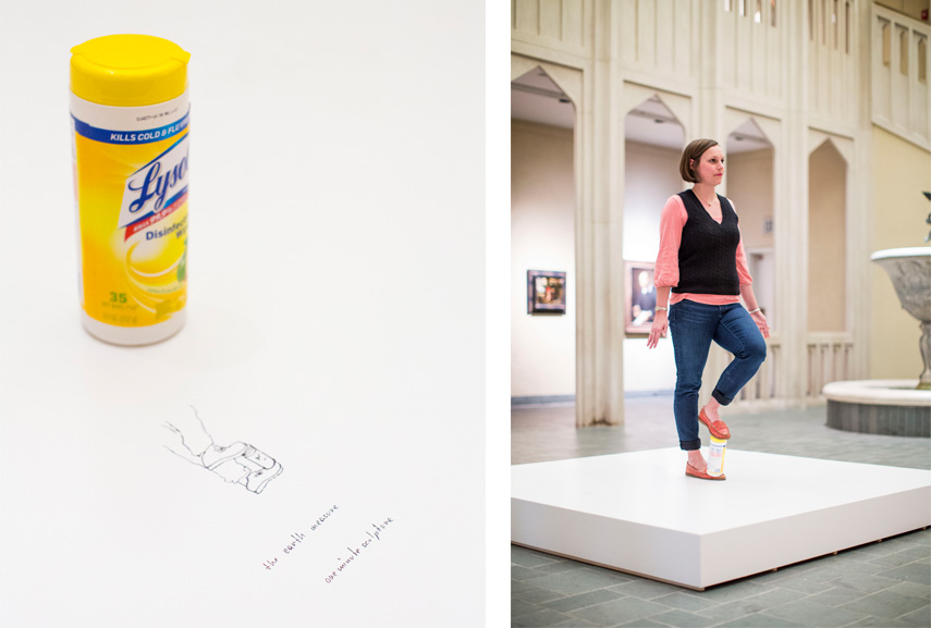 Erwin Wurm – The Earth Measure, 2015, From the series: One Minute Sculpture. Mixed media (instruction drawing, plastic bottle, pedestal), performed by the public. Euclidean Exercises, IMA (Indianapolis Museum of Art), Indianapolis, Indiana, USA. Photo: Courtesy Studio Erwin Wurm