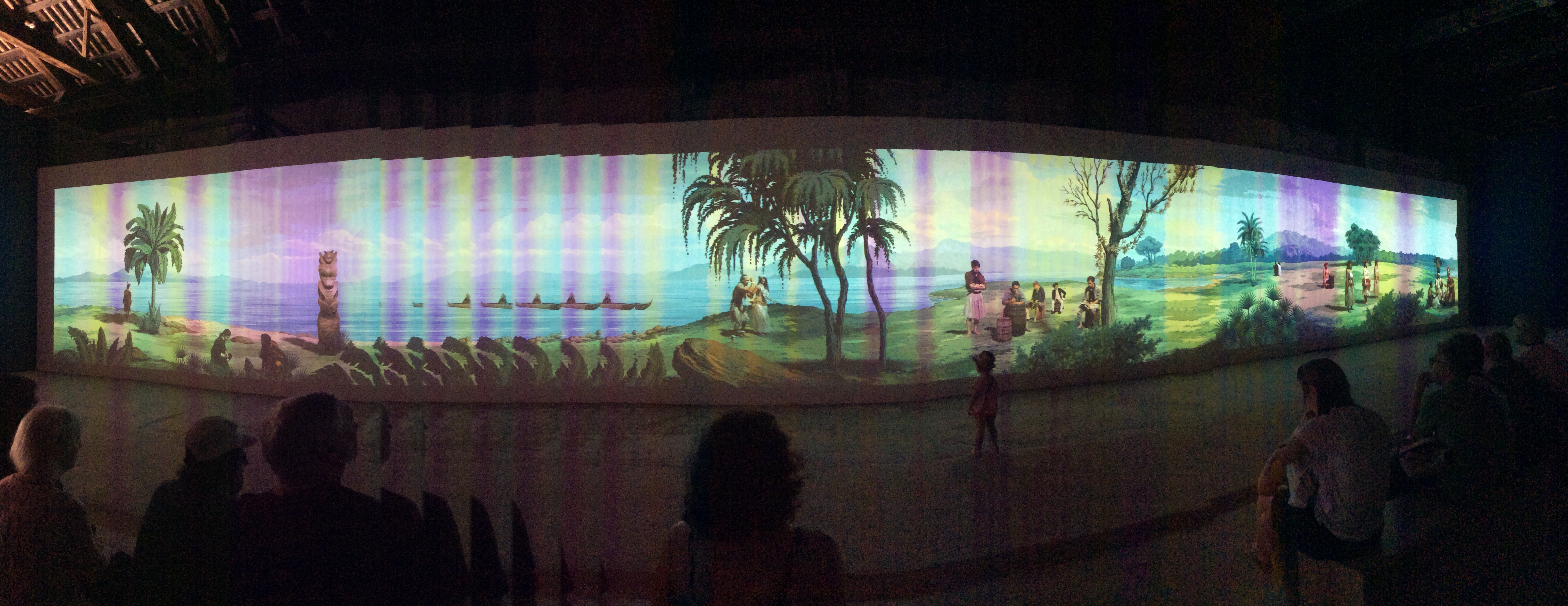 Lisa Reihana (1964), d’ascendance Maori, crée un fascinant pavillon pour la Nouvelle Zélande. La fabrication de « In Pursuit of Venus » a duré six ans, c’est une vidéo panoramique de 25 mètres de long sur 4 de haut constituée de scènes romantisées des premières rencontres entre polynésiens et européens, comme un long décor de papier peint qui se déroule sous nos yeux. Papier peint existant puisque l’artiste s’est inspirée de celui dessiné par Jean-Gabriel Charvet au début du XIXe siècle. Un exemplaire peut se voir au musée des tissus de Lyon.