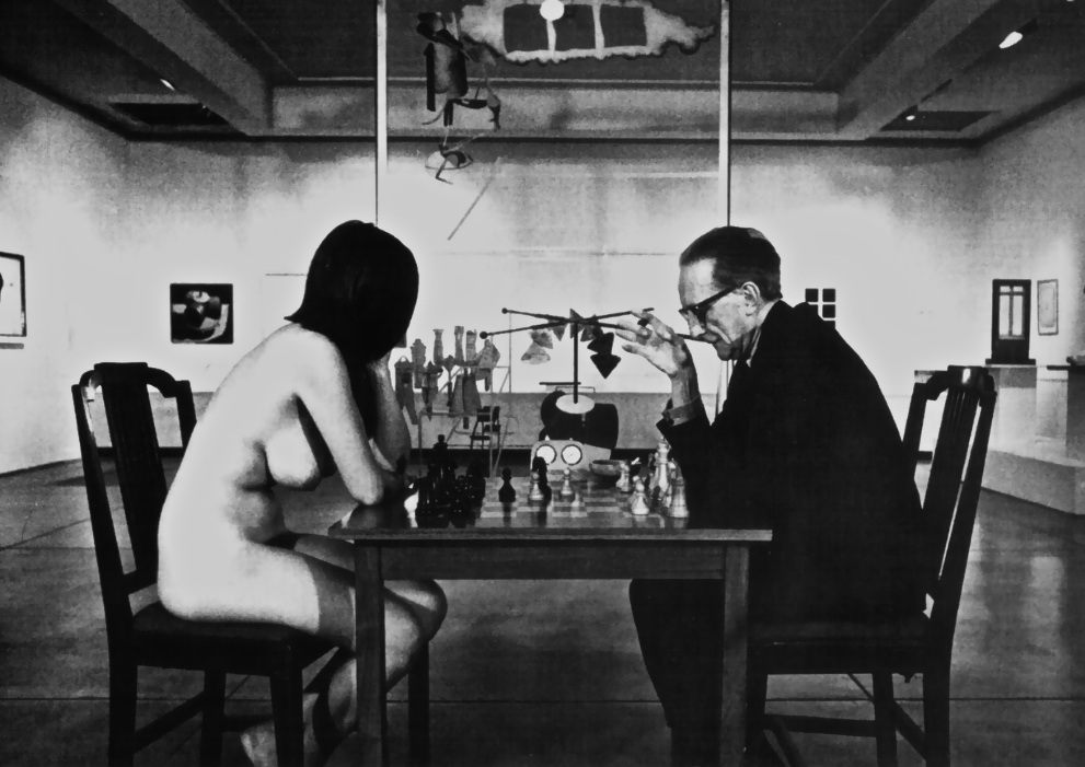 Eve Babitz et Marcel Duchamp jouant aux échecs devant le Grand Verre, Pasadenan Art Museum, 1963. Photo Julian Wasse.