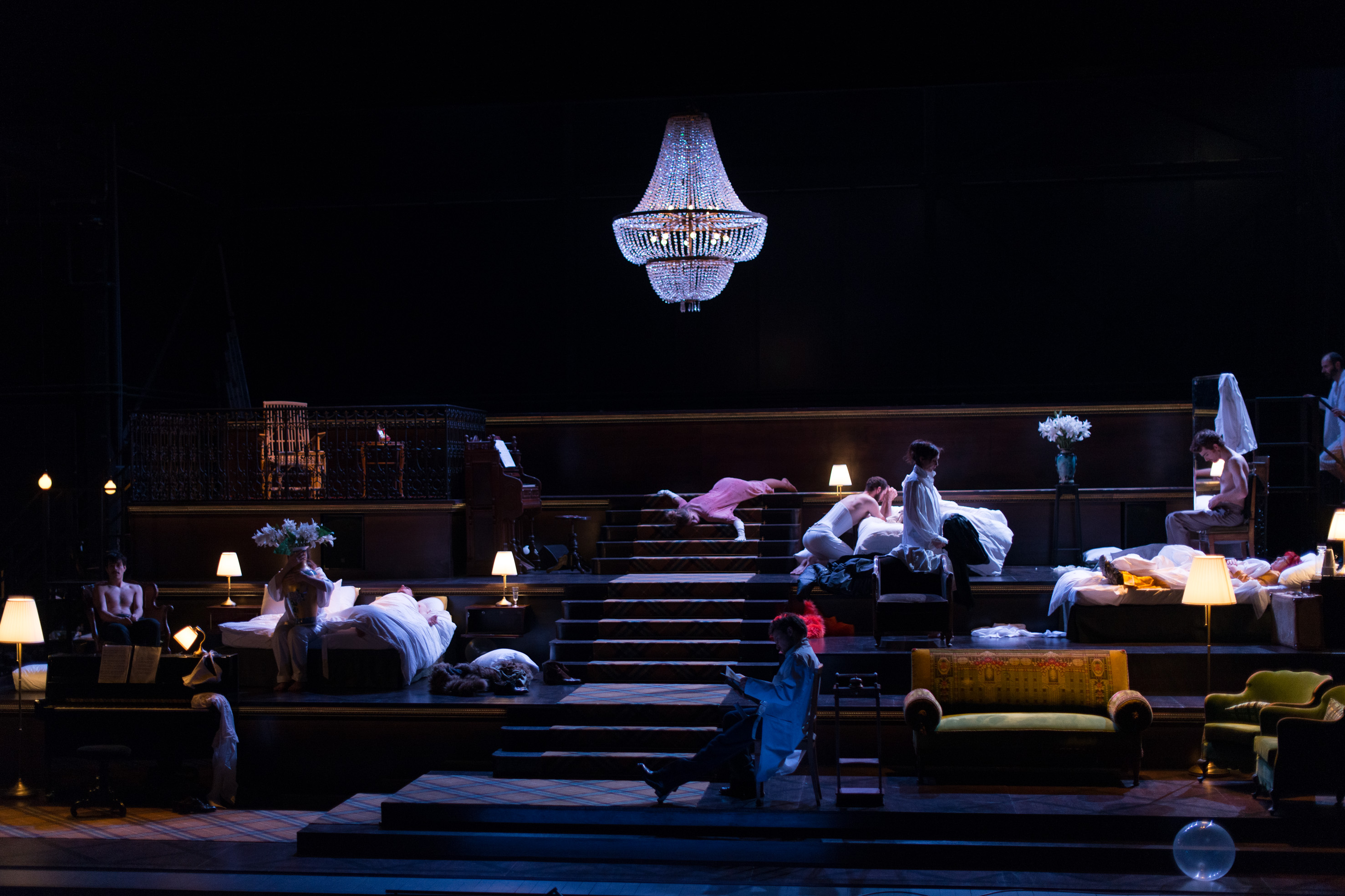 C’est une véritable chorégraphie que les comédiens déploient dans ce somptueux décor. Tout en déclamant quelques-uns des 229 fragments du texte de Mathieu Bertholet (ceux qu’ils ont la liberté de choisir sur le moment), ils investissent avec une régularité métronomique ce cocon inaltérable et fastueux. Pour leurs derniers instants, luxe, calme et volonté … de s’éteindre avec une certaine volupté.