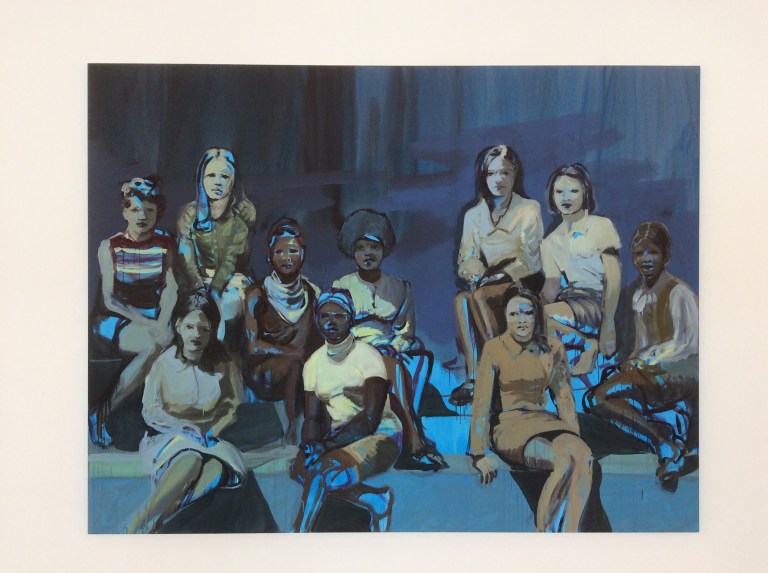 Toujours ce regard planté sur le visiteur… Groupe de jeunes filles assises. Libération en cours? des individualités se discernent, par le vêtement, par la position. Une peinture contemporaine et académique à la fois. Un fond neutre et des personnages en pleine lumière, l’éclairage est frontal et pourtant il règne une certaine pénombre.