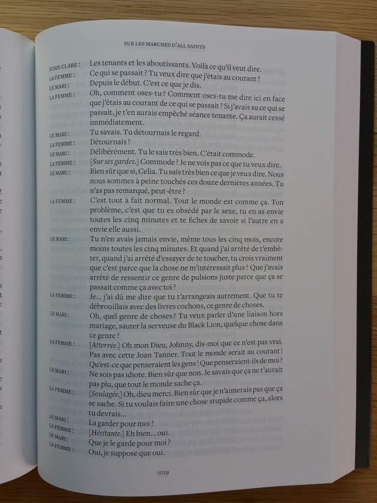 il oh putain il parle au tabouret vide à côté de lui quelqu’un m’a dit je m’en rappelle maintenant quelqu’un a dit qu’il l’avait déjà vu faire ça, dans un autre pub, au Fish je crois, ça doit être tout ce qu’il boit qui le rend comme çamême si bon il y a aussi la poésie c’est pas lui qui parle toujours de John Clareet tout le monde sait où John Clare a fini comment a-t-il su pour mon rêve le caleçon et ça ne me plaît pas comment j’ai fait pour m’embringuer là-dedans je ne mérite pas ça et (p.1103)