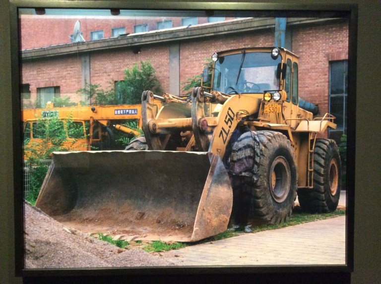 Dans la série ci-dessus dédiée aux transformations urbaines, l’être humain semble perdu, effacé par la monstruosité des machines. Comme dans celle des slogans, où il est submergé par les mots d’ordre politiques utilisés par les autorités comme outils pédagogiques. En les investissant, il invite à les reconsidérer.