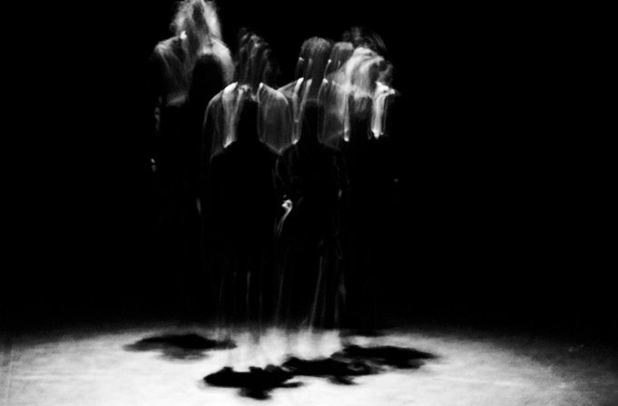 Dans l’ombre ténébreuse, quelques halos diffus. La première présence à se révéler est un rythme assourdi, nimbé d’un chant mélancolique. Emergeant des ténèbres, trois clartés surgissent. Imperceptiblement s’approchant, une silhouette s’ébauche. Remuante et pourtant immobile. Longuement. Puissamment. Se fondant dans sa nuit, deux autres la rejoignent. Pivots enracinés surmontés de fureur déchaînée, ils se déplacent pourtant. La nuit, ponctuellement, noie ces formes floues puis les laisse renaître. Elles sont cinq à présent, chimériques et démentes, poursuivies par l’impitoyable tempo. Des illusions de visages évoquent de monstrueux Bacon. Nina, au loin, fredonne sa mélopée flottante au-dessus du fracas régulier des darboukas. Le temps et l’espace dissous, comme les corps…