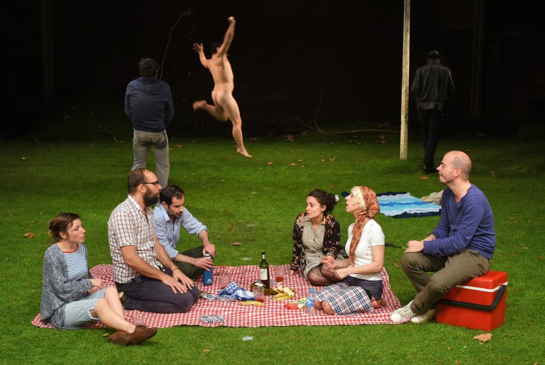 Comme le souligne un des comédiens : »Le thème est lourd: l’identité nationale ». Vaste question! Tous les poncifs et préjugés seront émis durant la pièce au grand plaisir d’un public hilare, émoustillé par la bêtise de ces clichés et autres propos de bistrot. Durant la scène du pique-nique, tout y passe, et avec jubilation: politique, féminisme, gauchisme, judéité, homosexualité, école, islam, etc. Le public, valorisé par sa distance, se régale de cette dérision qui lui semble si primaire. Et pourtant …les prémisses de certaines pensées secrètes se retrouvent peut-être dans ces désopilants commérages. Pendant que bêlent les moutons, le taureau  danse…