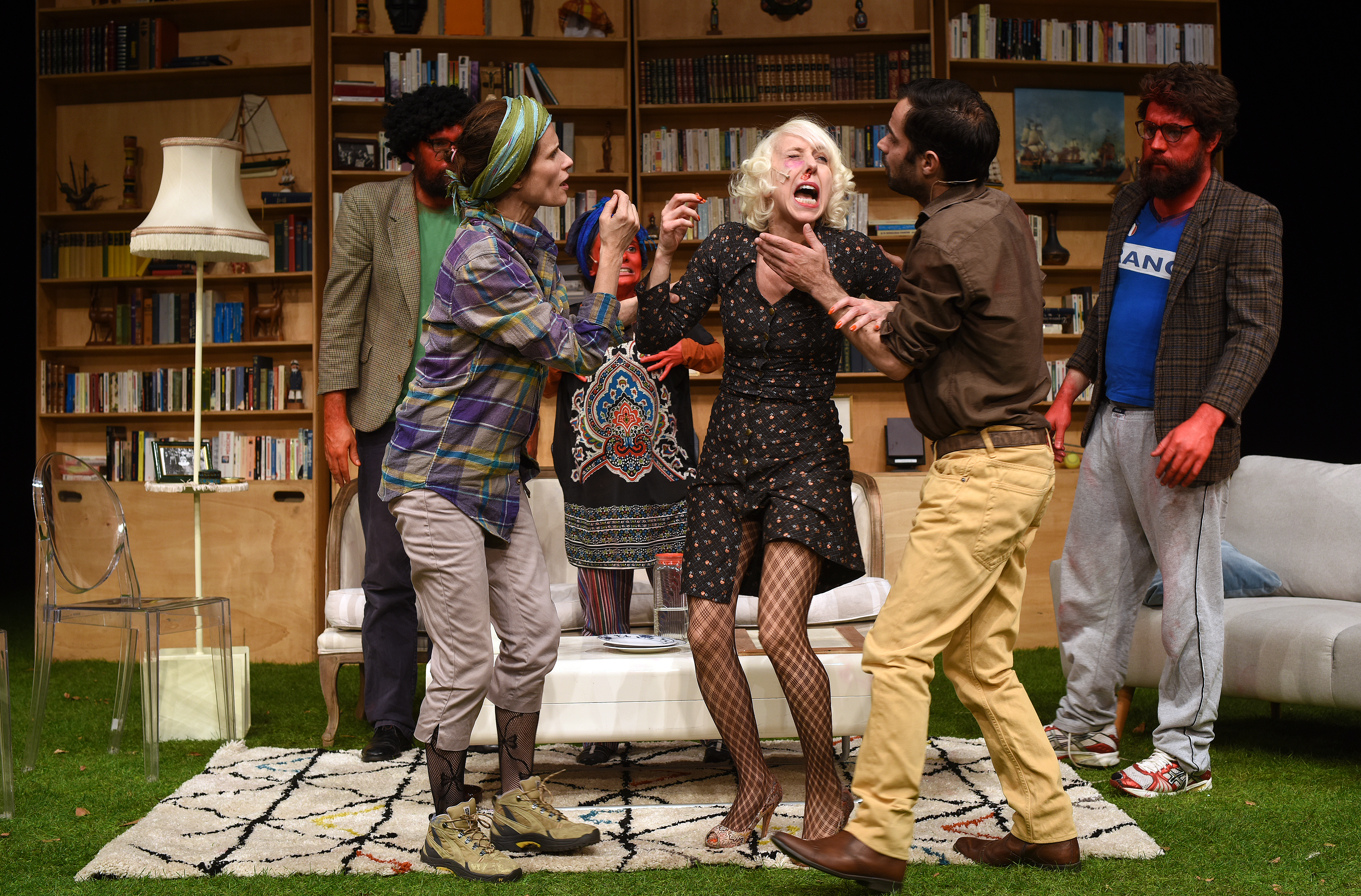 La représentation se découpe en plusieurs épisodes qui se terminent tous en altercations plus ou moins furieuses. Une cérémonie, un pique-nique, un bord de mer, un bureau d’accueil, un salon et même une autre planète. Chaque lieu est astucieusement figuré par quelques accessoires, déguisements ou ameublements.