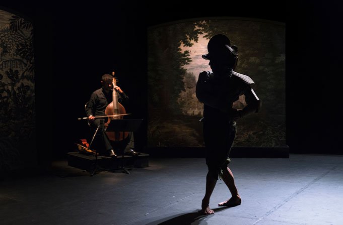 Je ne saurais décrire l’intensité particulière où nous entraîne la musique baroque de ce spectacle. Un autre univers, un temps suspendu, l’étreinte d’un passé mélancolique. Guitare baroque et théorbe, violes de gambe, bandonéon et percussions traditionnelles, instruments joués par quatre musiciens hors-pairs, accompagnent ce voyage dans le temps, l’espace et le genre.