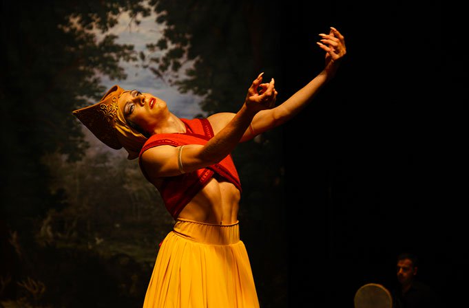 Faisant suite à une pièce uniquement musicale, interludes survenant entre chaque prestation dansée, apparait une créature équivoque, rayonnante de jaune et d’orangé, grandie par des échasses pointues qui, loin de la faire vaciller, l’entraînent dans d’étourdissantes virevoltes et des cabrioles acrobatiques et sonores. Exaltant un air de zarzuela datant du XVIIe siècle, elle chante l’archange, l’éphèbe, l’enfer torride et les amours impossibles. S’alanguissant soudainement, elle est soutenue par deux des musiciens, dans une émouvante avancée aux abords du public, le haut du corps déployant des arabesques improbables et divinement harmonieuses, tandis que, langoureusement, elle s’abandonne. Puis, la délivrant de ses pattes d’aigrette, les musiciens bienveillants se replient et la laissent en chaussons de danse pour une nouvelle tourbillonnante et troublante chorégraphie.
