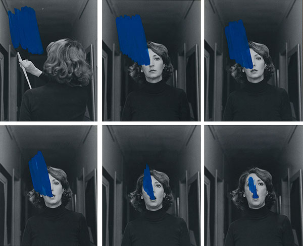 Helena Almeida, Pintura Habitada, 1978 10 B/W photographs and blue acrylic (29 x 19 cm) eachLa photographie lui permet de dépasser la peinture, la vidéo et les séries lui permettront de dépasser la photographie et de fixer ses « chorégraphies ». Pour Helena Almeida, la peinture crée l’espace et le bleu le représente le mieux. Elle s’approprie ce bleu comme Klein l’a fait en utilisant le corps des femmes comme pinceau! Une revanche? Non, elle ne se revendique pas comme féministe.