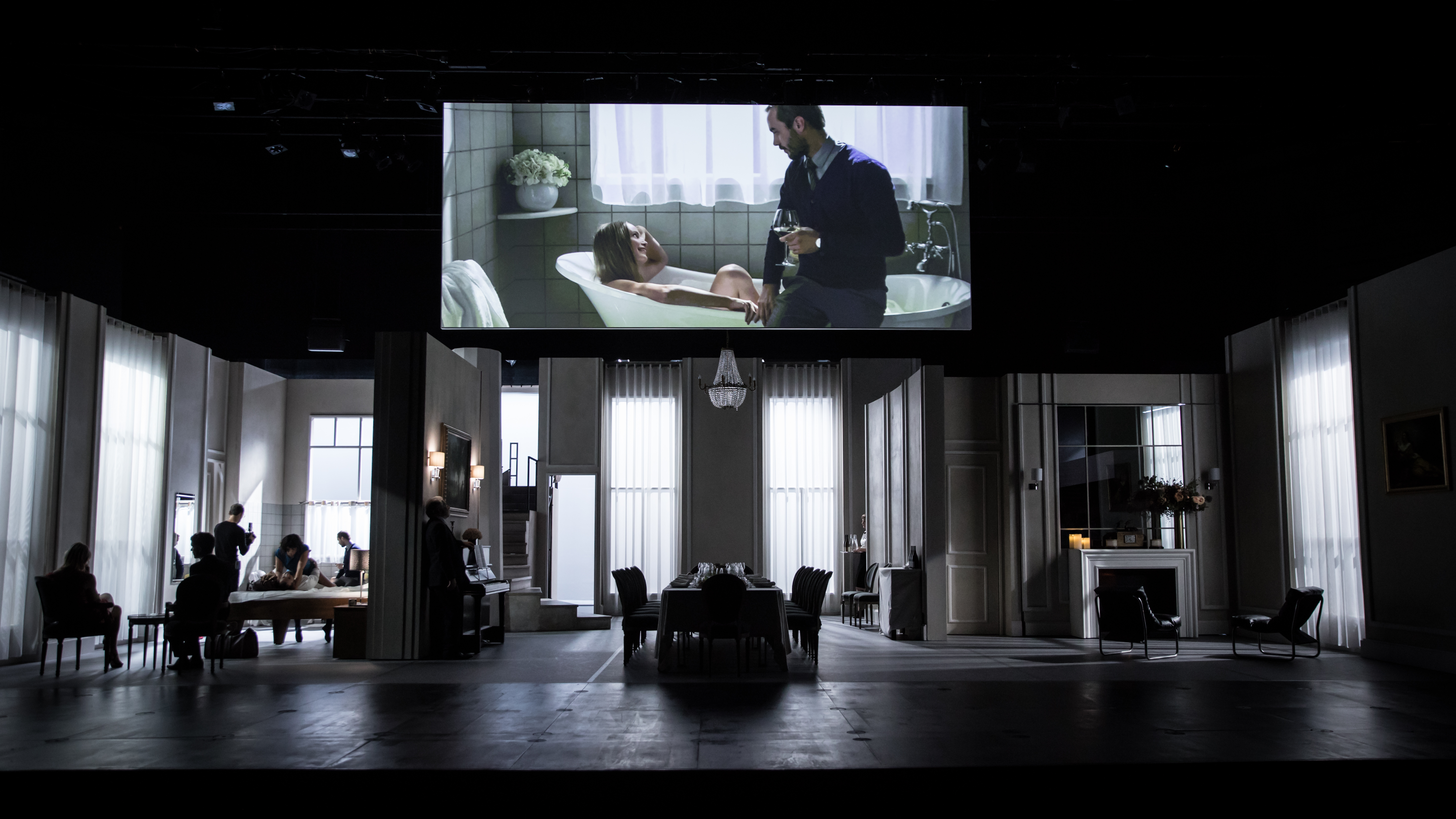 Le décor est saisissant, encore amplifié lorsqu’il est filmé par le steadicam (caméra stable). Deux pans de mur se révèleront mobiles, découvrant d’un côté la cuisine et de l’autre une chambre à coucher. La caméra, oeil rapproché du public, s’infiltre dans les hors-champs: coulisses, cuisine, lit conjugal et salle de bain. Elle s’accroche aux expressions en gros plans, se faufile dans l’action en plans séquences, se coule entre les protagonistes en plans rapprochés. La «performance filmique» à laquelle nous assistons appuie l’action théâtrale de ce dispositif cinématographique. En temps réel et à vue. Du grand art! Cette nouvelle écriture scénique est d’ailleurs identifiée par une charte créée par le collectif MxM.