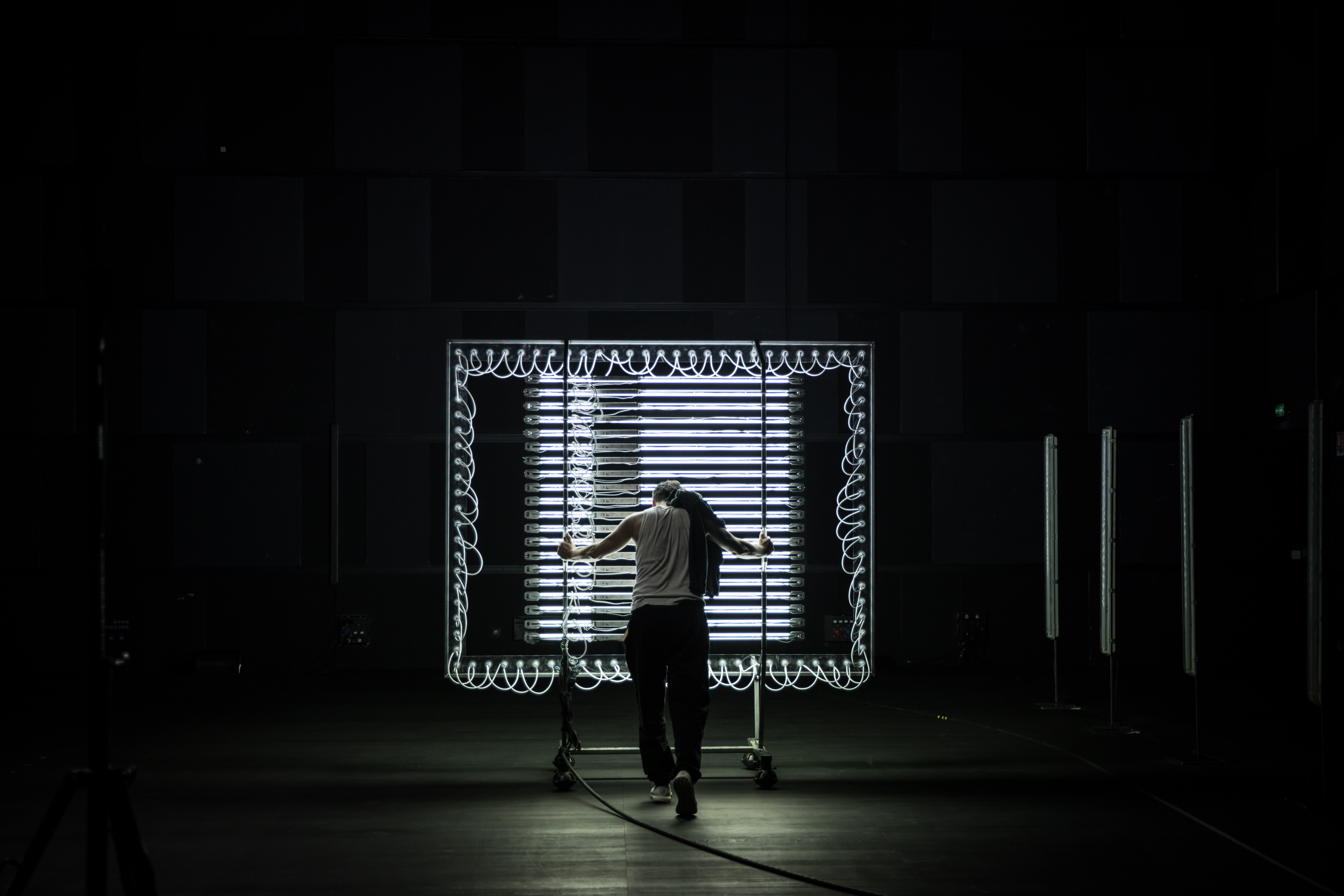 La scénographie est simple. Des rangées de néons de part et d’autre de la scène. Un grand cadre lumineux, une caméra sur perche et un mur mobile sur lequel son image est projetée. Comme si nous, le public, étions ses geôliers, nous pouvons observer sa détention et sa réalité. Les sons, de désagréables et puissantes vibrations, sont des électrochocs. Tel un aperçu de la douleur psychique ressentie par Anton. Car Frédéric Fisbach tient à produire un certain malaise, lui qui a mis en scène la pièce d’Hakim Bah « Convulsions », pour le moins dérangeante, vue au Festival Off d’Avignon.
