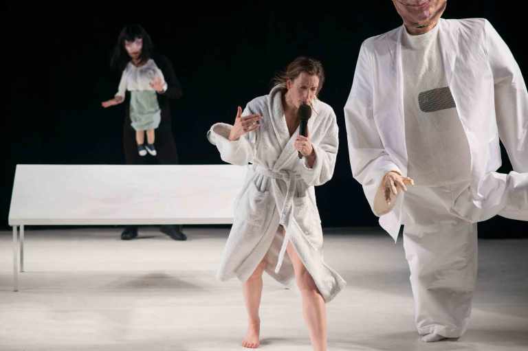 On a senti l’épuisement d’une fin de combat. En peignoir, telle une boxeuse, elle nous invite hors du ring, dans le sombre couloir du théâtre et là, elle baisse enfin les bras et quitte ses gants. Sur la scène apparaissent alors ses immenses mains, symboles d’accueil et de partage, et une tête gigantesque dont le regard exorbité projette le feu sacré qui habite le coeur de Cécile.