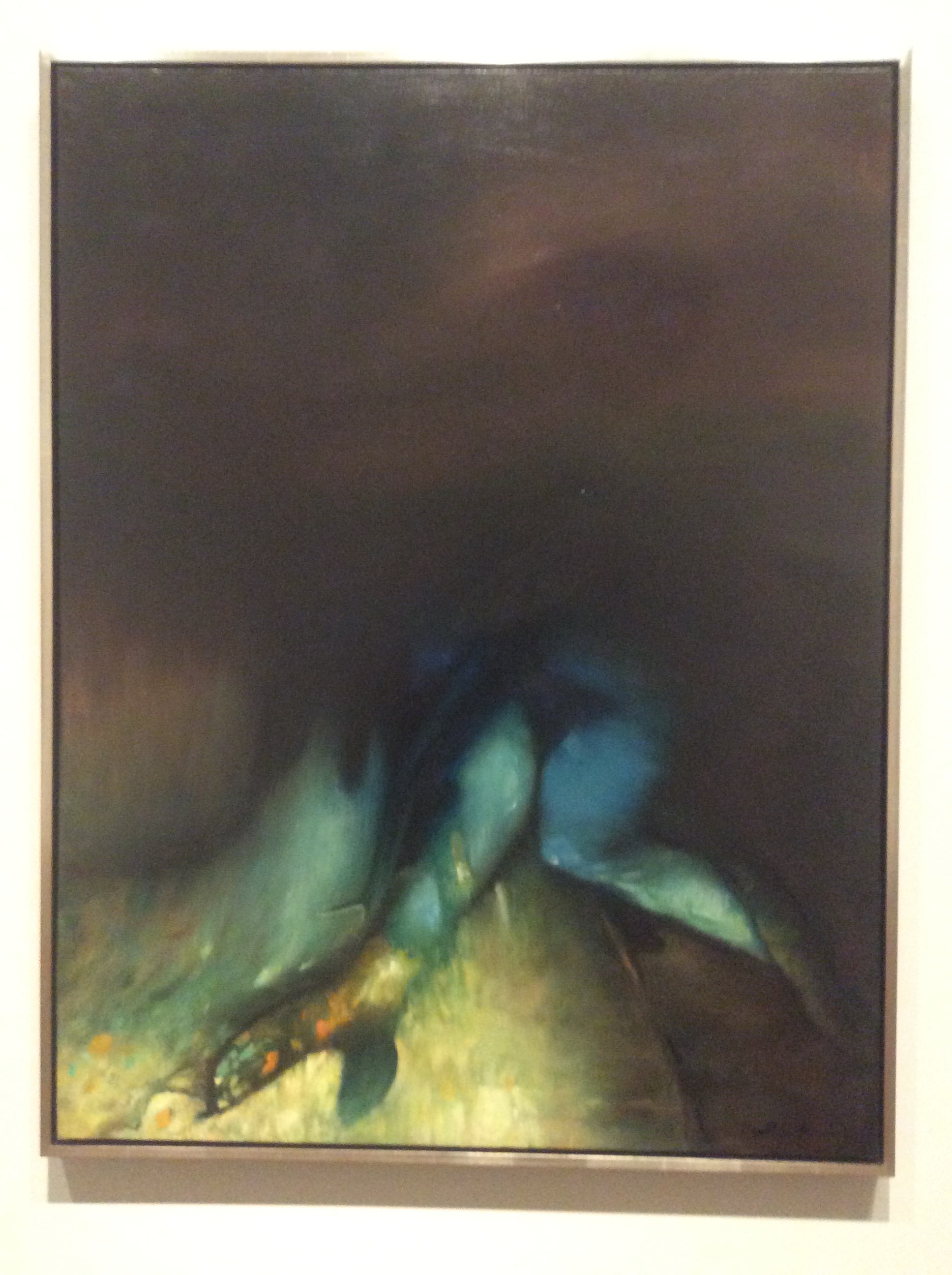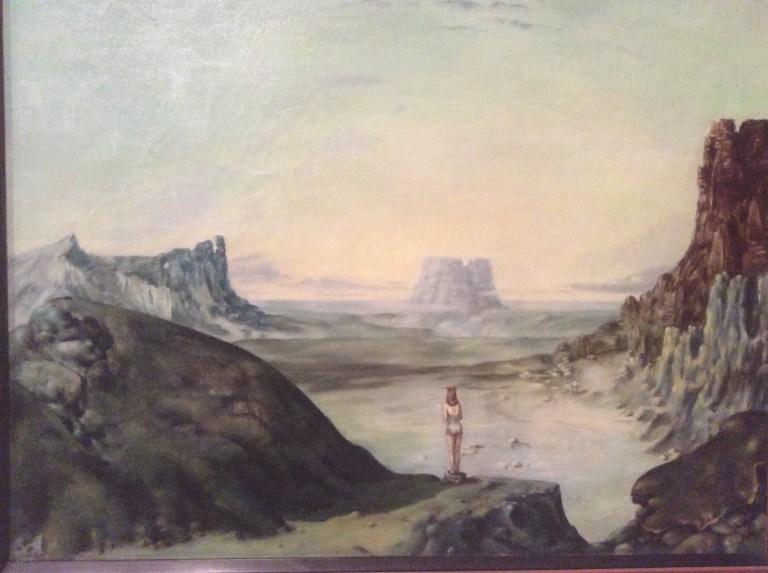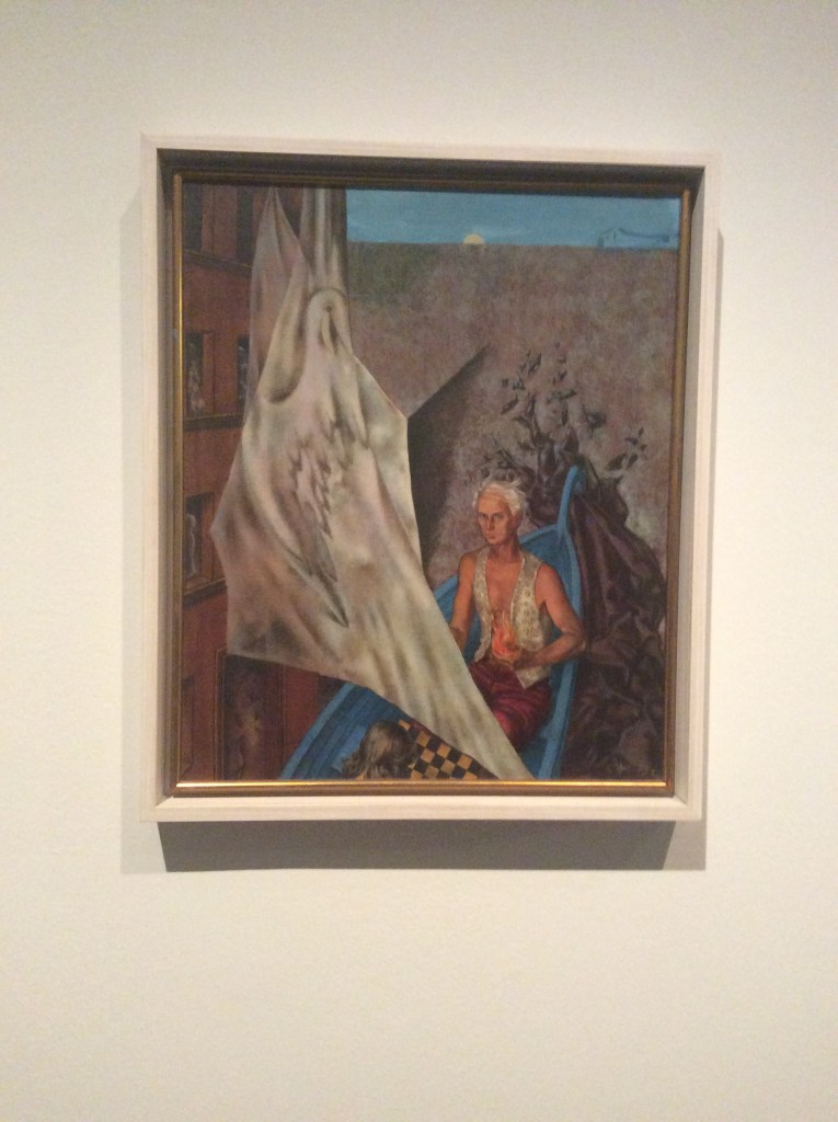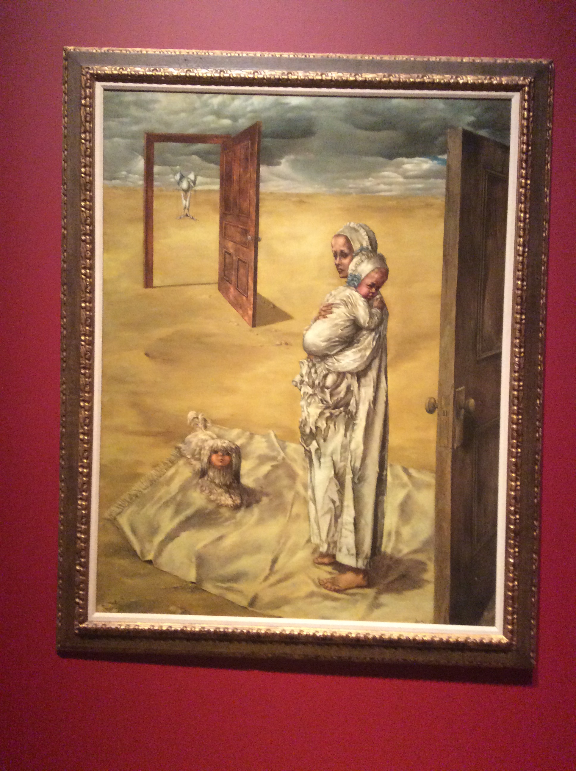 Seconde chambre de l’exposition, Derrière la porte. Portail de l’inconscient, la porte ouverte représente choix et possibilités, elle enferme aussi les peurs et les désirs secrets. Installés à Sedona, elle vit avec Max Ernst au coeur du désert de l’Arizona. Paradoxalement, la nature immense qui l’entoure la pousse à l’introspection et sa peinture reflète sa recherche psychique, son évolution personnelle. Elle peint des intérieurs et se représente près de portes, de couloirs labyrinthiques, utilisant le vocabulaire pictural des surréalistes. « Les portes, pour moi, sont des miroirs » dit-elle.
