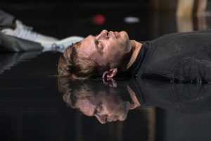 Ou est-ce la lenteur des mouvements des acteurs sur scène? L’irrépressible envie qu’il se passe quelque chose. Elle a beau monter sur une table, le mort se dresser un instant, la fille croquer la pomme, la femme sortir de scène et ajouter son souffle à la bande son, rien à faire. Le sens de ces actions m’échappe. L’émotion est absente. En dehors du magnifique procédé eau/lumière, malheureusement, je m’ennuie.