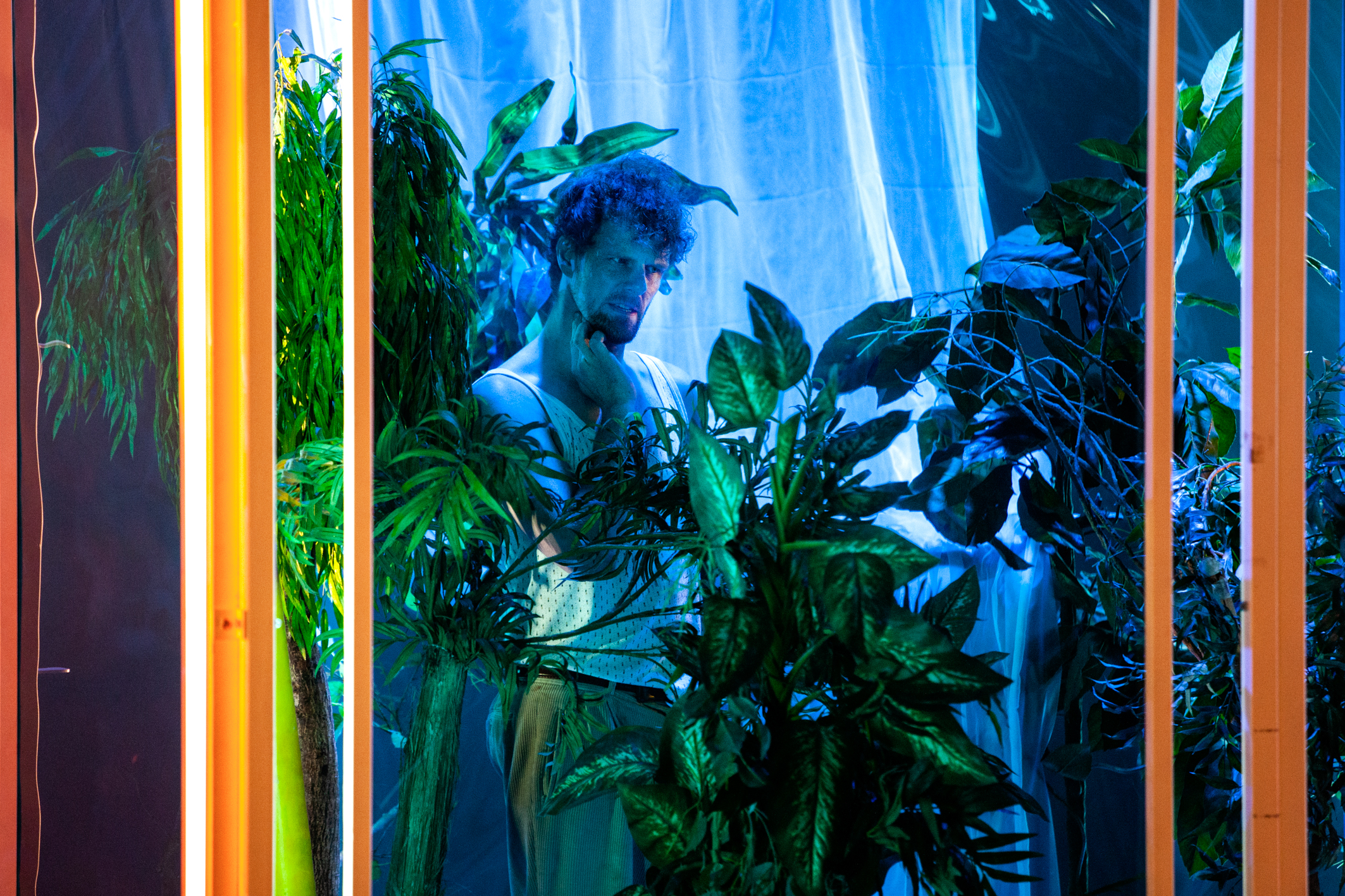 La splendide scénographie de Christian Friedländer sublime le propos mythologique tout en l’actualisant. Mêlée aux lumières de Henning Streck, c’est par moment une véritable symphonie d’images lumineuses. La création sonore (Daniel Dorsch) modulée dans son intensité et sa texture, reflète le sens expressif du récit, tour à tour écrasant, tourmenté puis délicat et étincelant. Elle est accompagnée en direct par le trompettiste Paul Brody et du pianiste Michael Wilhelmi. Les comédiens jouent d’un burlesque accompli. Et comme dans les mythes, certains mystères demeurent. Ainsi, pourquoi le bras en écharpe? La cigarette?