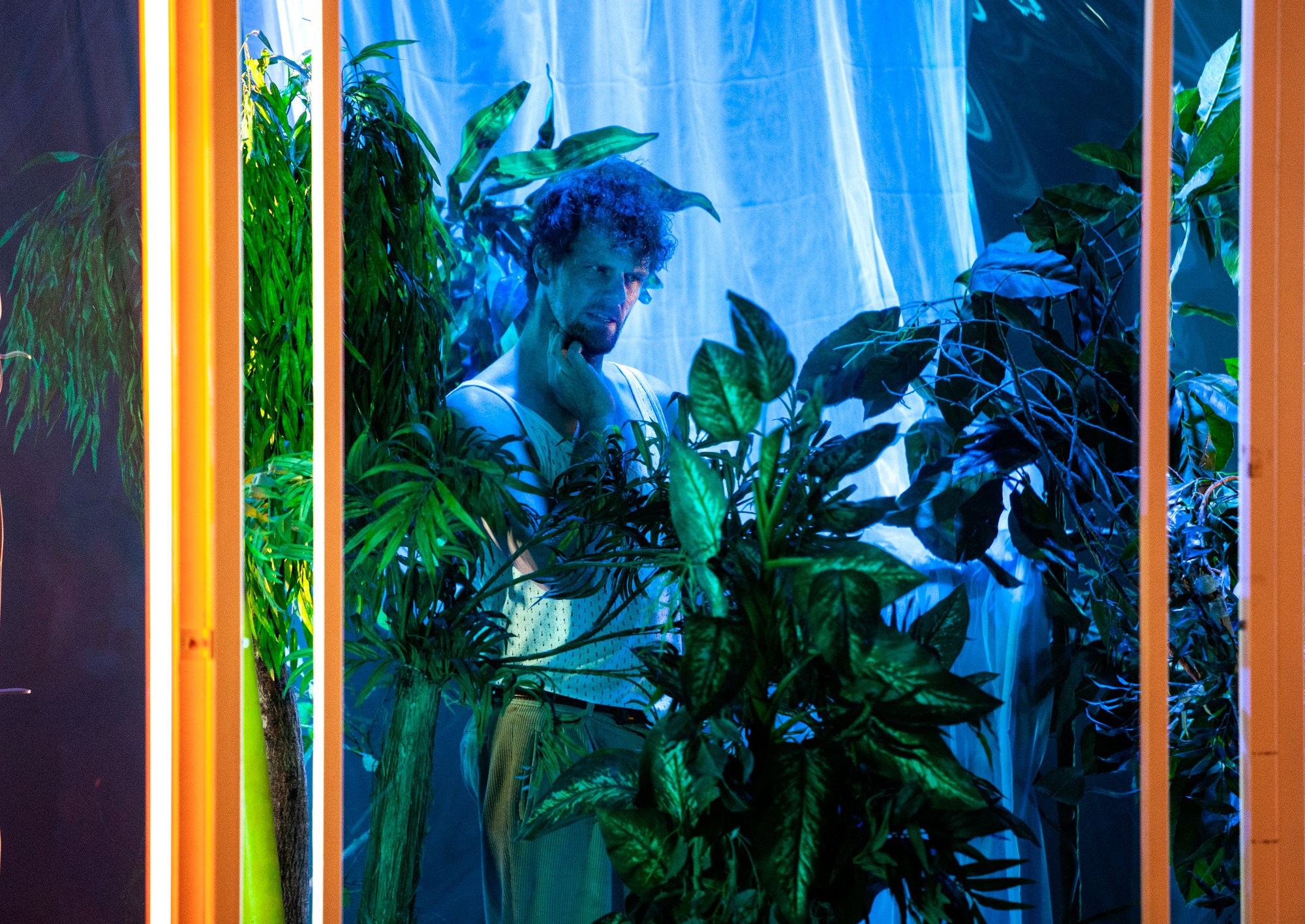 Sur le plateau, cinq cages ou cabines, chacune d’une couleur différente, revêtues de parois transparentes. On distingue un piano dans l’une, une autre est garnie de plantes vertes, et dans une troisième, incongru, un tourniquet à cartes postales. Les sonorités qui nous entourent sont empreintes de mystère, assourdies, graves. Un passage de chant lyrique, un extrait de générique connu, un souffle de vent…