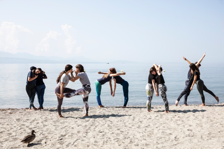 Le bleu uniforme du ciel. Au loin les Alpes, devancées par le lac étale et la pelouse de ce vaste espace où le public est invité à se disperser. Douze silhouettes immobiles sont ployées, en appui mains et pieds, éparpillées sur une cinquantaine de mètres.
