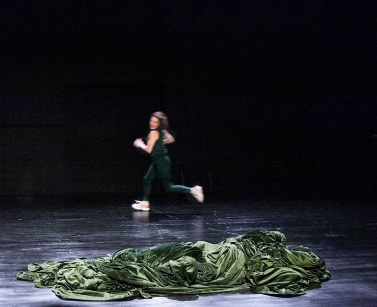 Le plateau est recouvert d’un tissu drapé, harmonieusement façonné de plis et de replis, de froncements et de sillons. Un environnement vert forêt, un vert nature, symbole de calme, d’équilibre, d’espace. L’excellente mise en lumière de Philippe Gladieux prête à ce vert de superbes nuances, accentuant une atmosphère d’intimité ou au contraire, d’isolement, allant jusqu’à lui donner des reflets mordorés. Un flux de remous avec lequel la comédienne va jouer tout au long de la représentation, lui donnant des allures solennelles ou douillettes, hiératiques ou enveloppantes.