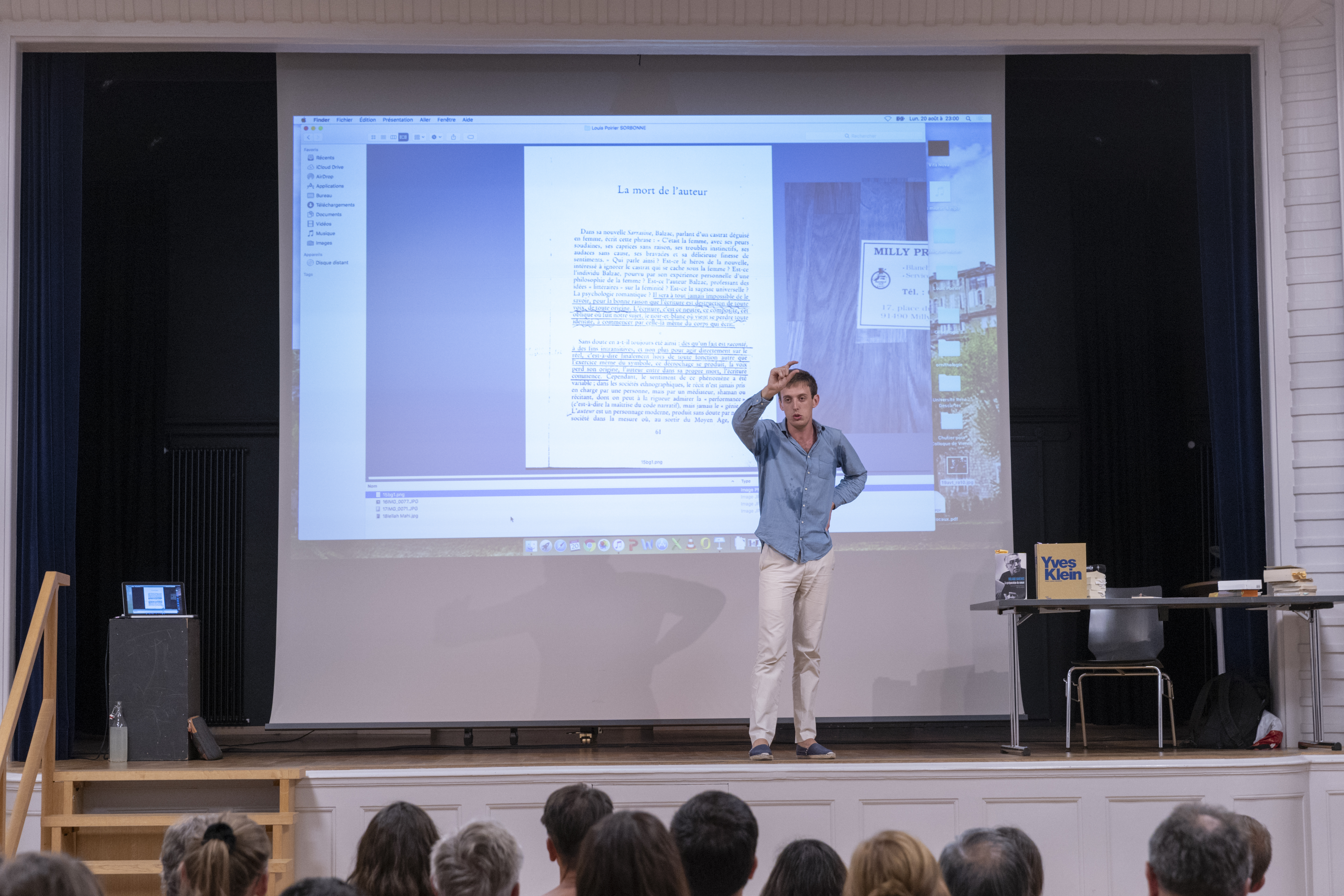 Un grand écran comme fond de plateau, une table de conférence où s’empilent des volumes à cour, une petite console à jardin pour lancer les diapos depuis l’ordinateur, tout ce qu’il faut à notre chargé de cours pour investir totalement l’espace, celui de la scène, mais aussi celui du public et des coulisses! Adoptant d’abord la posture courbée du rat de bibliothèque, le nez dans sa documentation, puis peu à peu se redressant, exalté par le sujet de son enquête littéraire, courant d’un bout à l’autre du plateau, découvreur d’une géographie qui lui semble jusqu’alors inexplorée, le comédien nous entraîne à sa suite dans un dédale de conjectures savoureuses et improbables, conduit par l’énigmatique Louis Poirier.