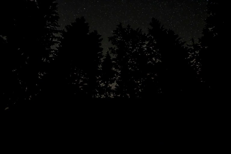 Adaptant notre rythme au marcheur qui nous précède, nous apprenons à nous déplacer sans voir où se posent nos pieds. La lune, dans son tout dernier croissant, est invisible ce soir, le ciel constellé d’étoiles. Il est le fond de scène sur lequel s’appuient les vrais acteurs de ce spectacle: les arbres, la végétation, les animaux invisibles et quelquefois audibles. Grattements discrets, chuintements, hululements, stridulations des grillons.