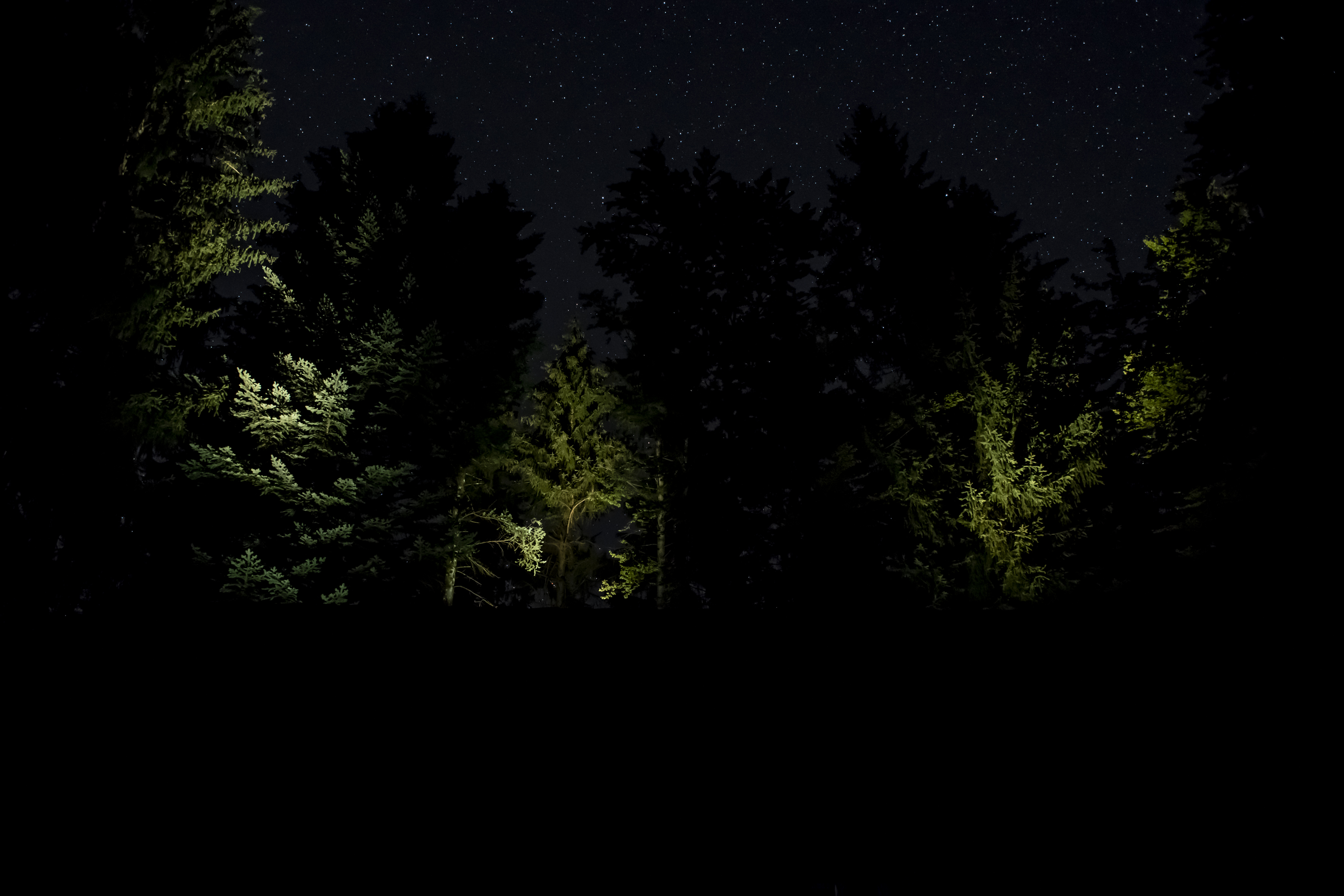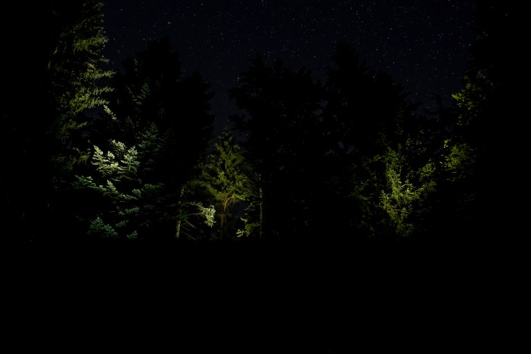 Chacun de nous est marqué sur le dos d’un rectangle fluorescent, une légère lueur, le petit caillou blanc que nous suivons. Entre les arbres, ces géants, nous voilà minuscules et fragiles. Leurs silhouettes, imposantes ombres chinoises, nous surplombent avec majesté. Menaçantes ou protectrices?