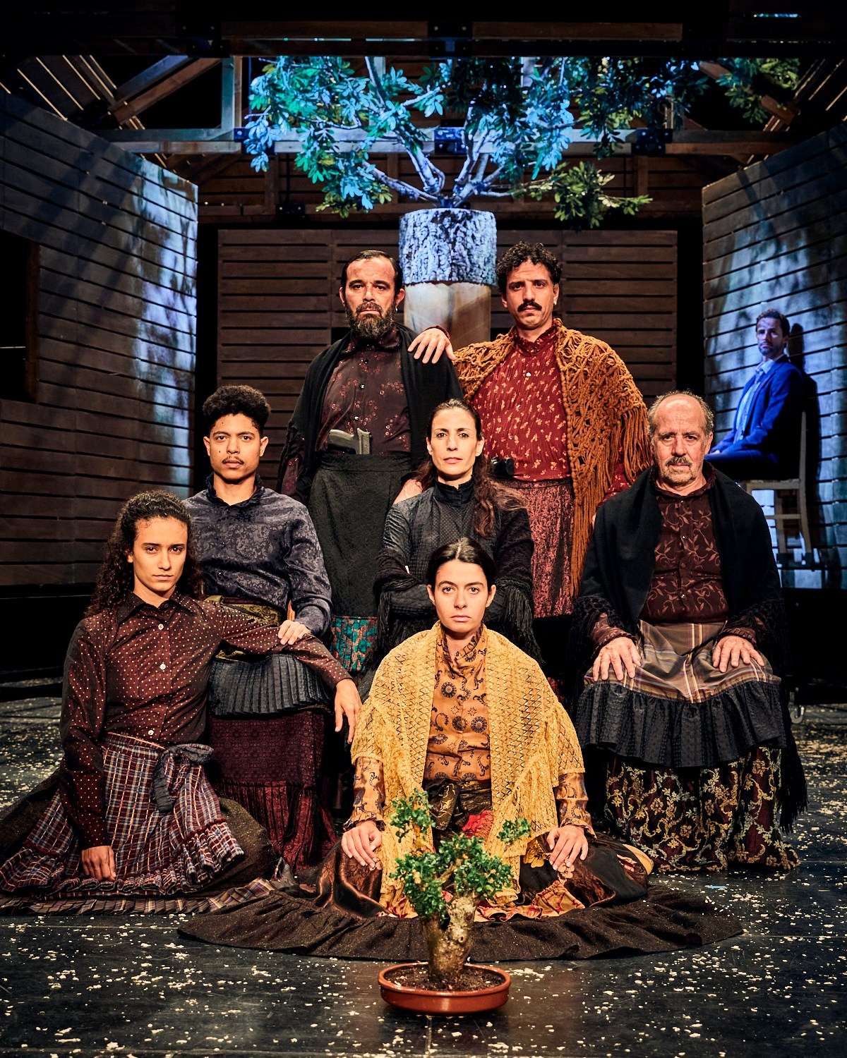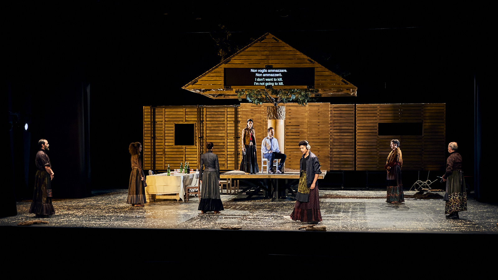 Le sol est terreux. Une cabane de bois surélevée, envahie par un chêne-liège, trône au centre de la scène: c’est le foyer, l’origine, les racines. D’un côté, une longue table garnie attend les convives. Pour l’instant, il n’y en a qu’un, en bout de table, silencieux et incongru, dans une tenue de ville.