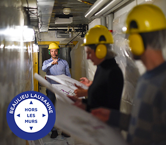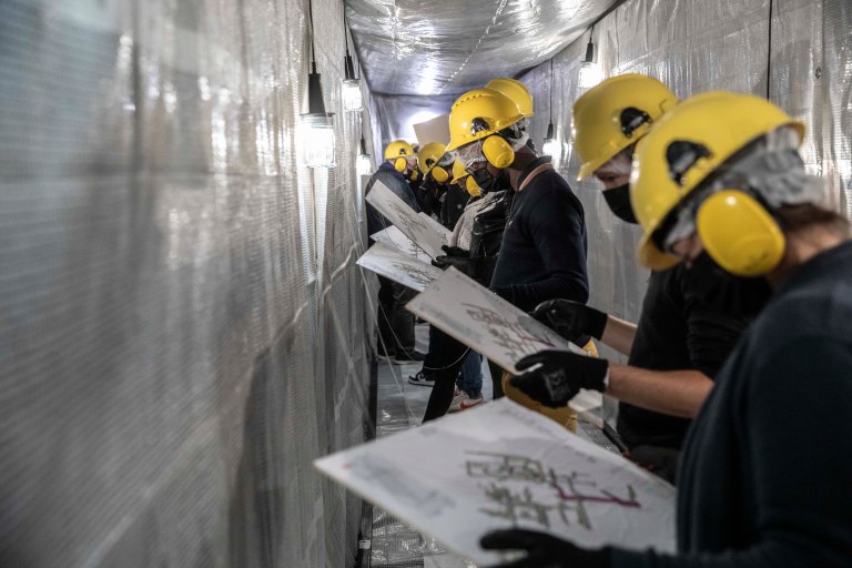 Au seuil de l’immensité de l’une des halles du Palais de Beaulieu, c’est par le son que commence notre immersion. Impacts, fracas, sirène, grincements accueillent les visiteurs désinfectés et coiffés d’une charlotte. Une grue, des échafaudages, du matériel de construction, un baraquement central, des plate-formes métalliques ainsi que de grands écrans constituent le décor réaliste d’un chantier en activité. Nous sommes divisés en huit groupes et dirigés vers le premier des huit postes animés chacun par un.e expert.e. : un avocat du droit de la construction, un ouvrier, un urbaniste, un entrepreneur, un spécialiste des insectes bâtisseurs, une conseillère en investissements, une travailleuse chinoise et un représentant d’un organisme anti-corruption. Coiffés de casques audio, isolés phoniquement du brouhaha du chantier, nous pouvons être attentifs à leur discours.