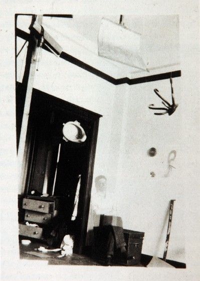 En 1941, MD termine sa première Boîte-en-valise. On y voit entre autre une miniature de l’urinoir et la photo de l’atelier de Duchamp avec cet urinoir (différent de l’original photographié par Stieglitz) mystérieusement suspendu. A noter: c’est la première fois qu’il fait mention de Fountain dans son oeuvre. L’artiste (ou HP Roché?) est un fantôme qui s’efface et la photo pourrait être, semble-t-il, une superposition de négatifs.