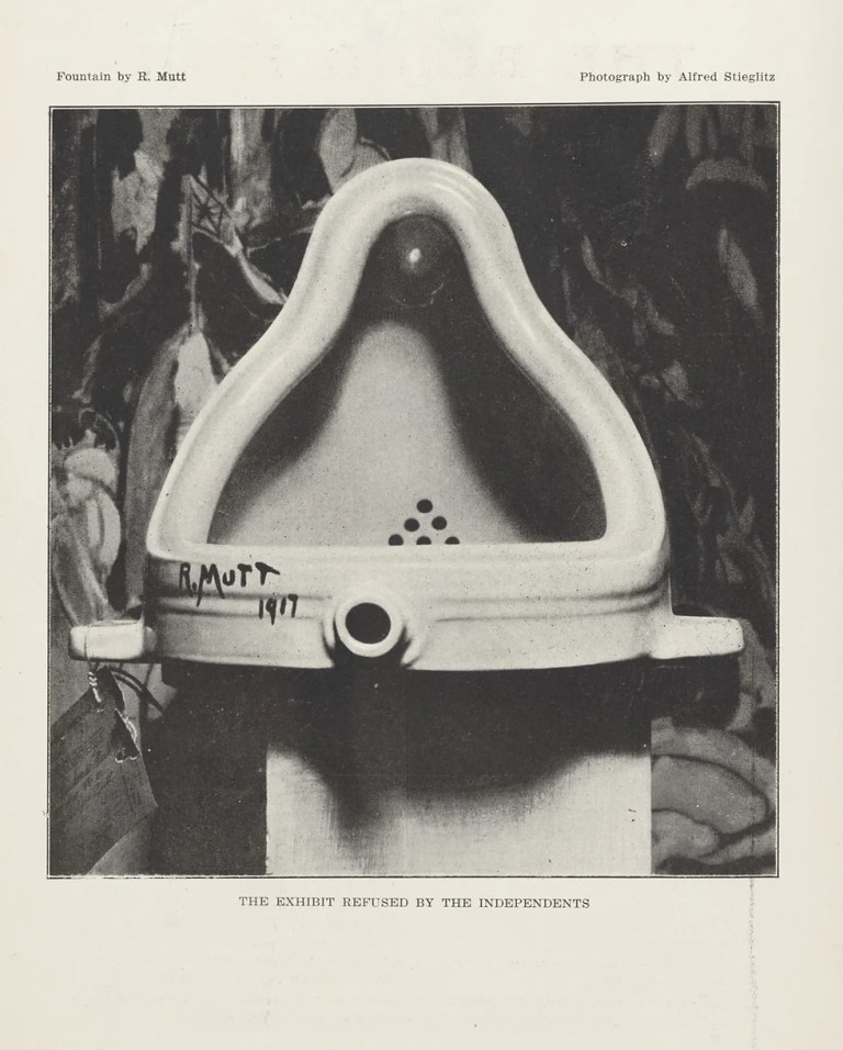 Quelques jours plus tôt, Marcel Duchamp, accompagné de Joseph Stella et Walter Arensberg (homme de lettres, collectionneur et mécène), achète un urinoir en porcelaine dans une plomberie (J.L.Mott Iron Works) de la 118e Rue. Il le signe R.Mutt. (c’est MD qui raconte cela à Arturo Schwarz, mais bien plus tard)
