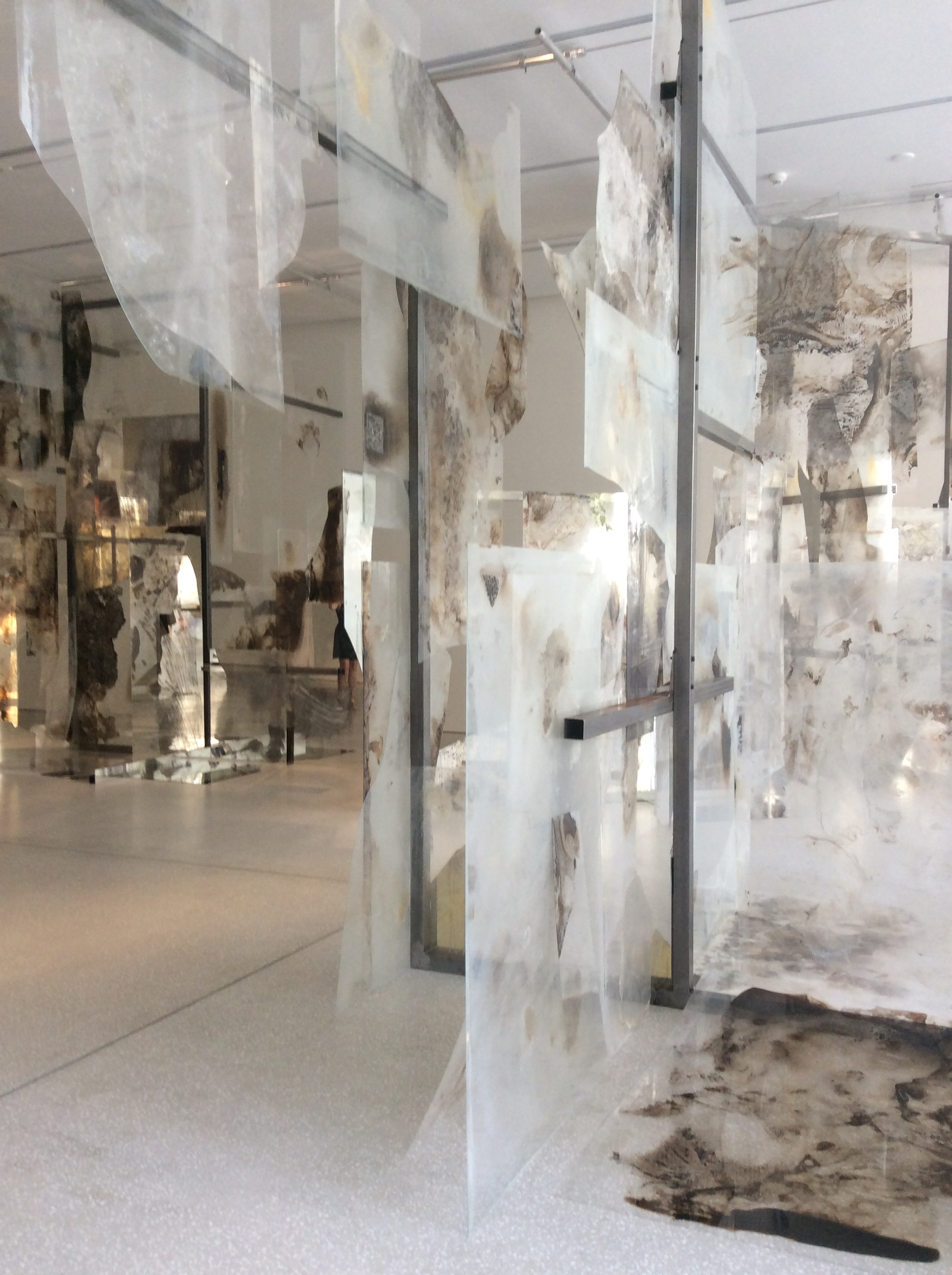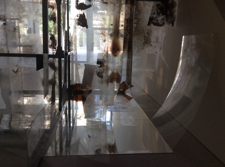 Tu te déplaces dans ce lieu avec précaution. Tu découvres les matières qu’il suggère. Nuages, peaux, déserts, feuilles, fumées, écritures, stries, plumages, tissus. L’endroit est marqué par le feu, ces éclats de verre ont été carbonisés, transformés, domptés. Entre la baie vitrée séparant la salle de l’extérieur et cette forêt de cristal charbonneux et laiteux à la fois, se répondent l’ordre et le chaos, l’entier et le morcelé, la transparence et l’opacité.