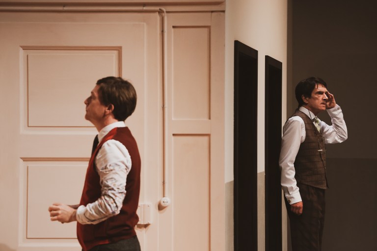 Le musicien et le comédien-chanteur Graham F. Valentine, tous deux élégamment vêtus, habitent cet endroit intermédiaire, un entre-deux quelconque, le monde extérieur étant seulement figuré par d’invisibles présences sonores: un chien, un voisin accommodant ou acerbe suivant les circonstances, un facteur fort généreux dans ses distributions de courrier, l’esprit exaspéré du radiateur rebelle.