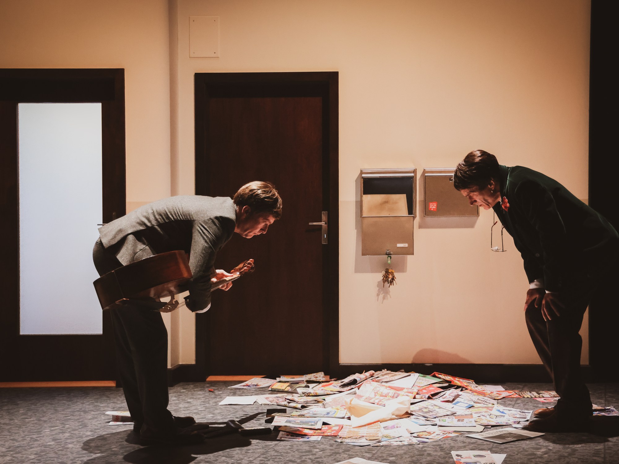 Le musicien et le comédien-chanteur Graham F. Valentine, tous deux élégamment vêtus, habitent cet endroit intermédiaire, un entre-deux quelconque, le monde extérieur étant seulement figuré par d’invisibles présences sonores: un chien, un voisin accommodant ou acerbe suivant les circonstances, un facteur fort généreux dans ses distributions de courrier, l’esprit exaspéré du radiateur rebelle.